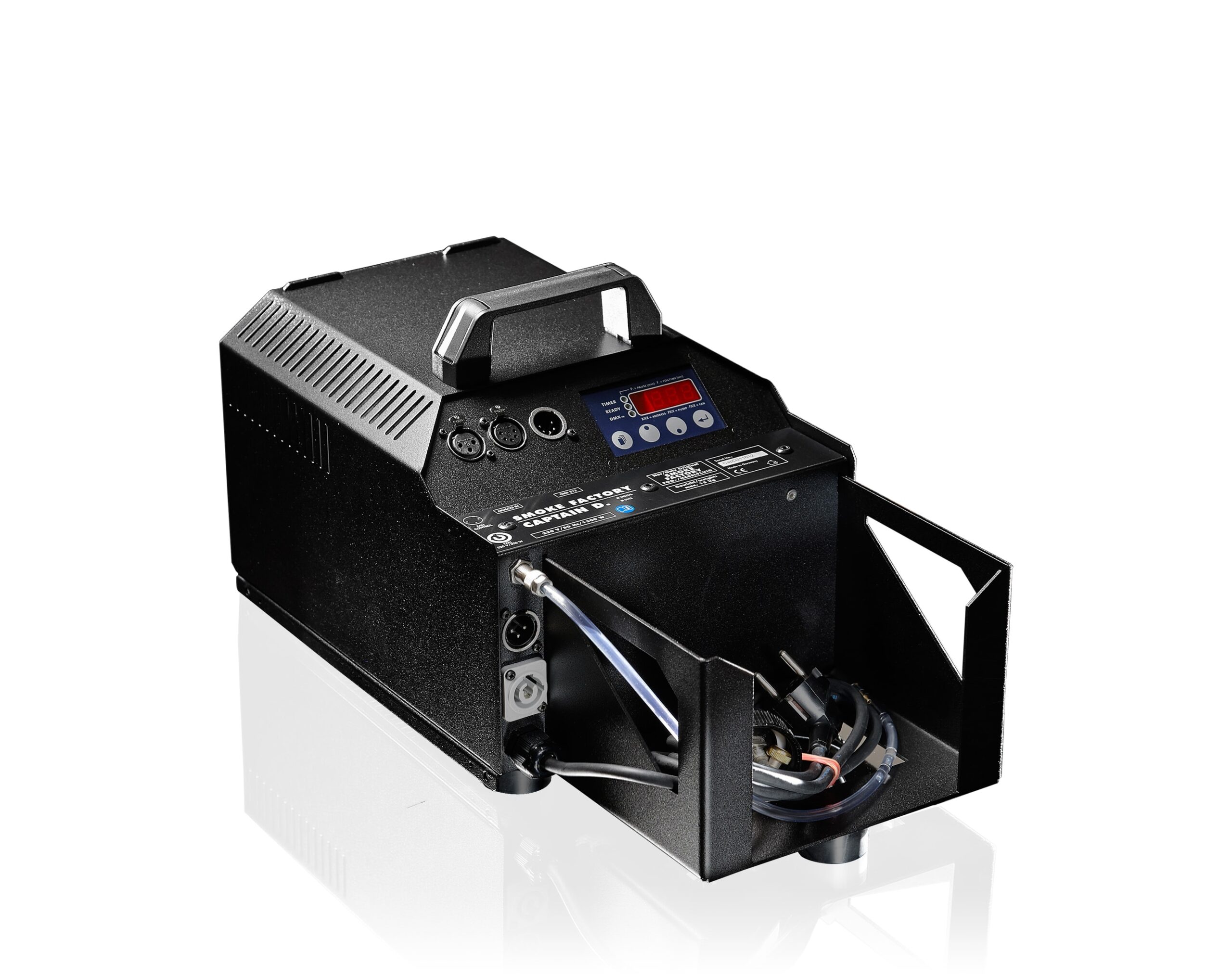 Natürlich lässt sich die Captain D., wie fast alle Smoke Factory Nebelmaschinen auch im Stand-Alone Modus oder mit dem integrierten Timer bedienen. Im Stand-alone Betrieb wird der Nebelvorgang durch einmaliges Drücken der Enter-Taste gestartet. Falls diese nicht wiederholt betätigt wird, nebelt die Maschine bis zum Erreichen der Grenztemperatur ab.